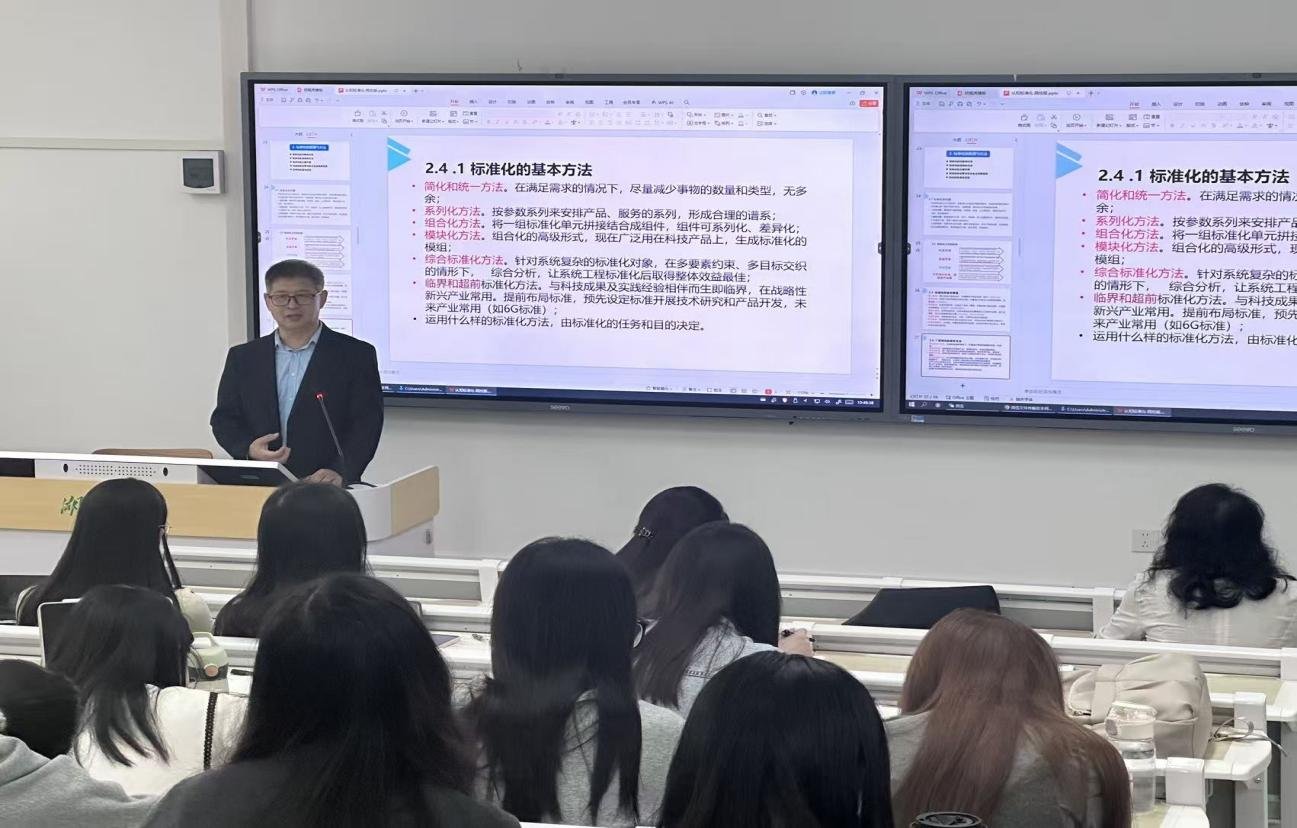 许钦祥现任湖北省市场监管局二级巡视员,国家技术标准评审专家,国家标准委全国标准化教育工作组委员。他的讲座主要就标准化的原理、方法和应用三个方面展开,结合标准化工作实践与行业典型案例,深入浅出地向同学们介绍了标准化工作的基本原理与主要技术方法。他强调,“标准的本质就是规则,标准的核心是技术”,标准是人类文明的重要成果,不仅能助推创新、引领发展进步,更直接决定质量水平,深刻影响经济社会发展全局。